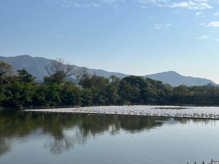 浮動太陽能系統 水上太陽能發電 浮動太陽能發電系統 產品優點 減少水塘的水分蒸發,維護水源(減少水塘暴曬在太陽下) 抑制藻類生長,改善水質(減少光合作用) 減少碳排放(減少使用化石燃料) 提高系統的發電效率(水的冷卻效果) 浮動太陽能發電系統是將光伏太陽能板安裝在浮台上,它的運作原理與安裝在陸地的太陽能發電系統相同。兩者都是應用光伏太陽能板來收集太陽能再轉化為電能,提供電力,減少使用化石能源及其所引至的碳排放量。 圖片來源香港水務處 浮動太陽能案例